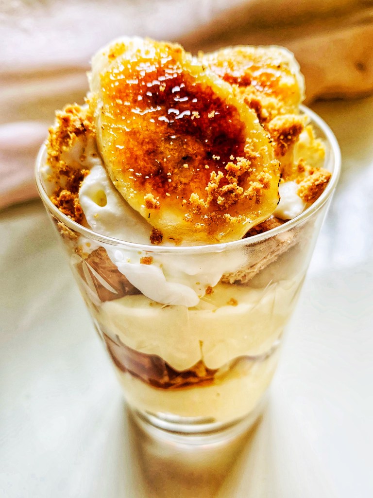 - Garnish the trifles with caramelized banana and more crumbled biscuit.