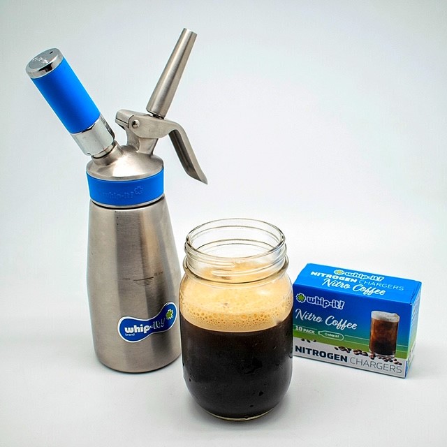 Now if you don’t feel like heading over to a Starbucks or your favorite coffee spot for a nitro on tap…or installing a keg system in your home…or cracking open a pre-made bottle out of a grocery reach-in, you can easily fashion your own homemade nitro cold brew with a Whip-It! cream dispenser and Nitro Coffee charger.