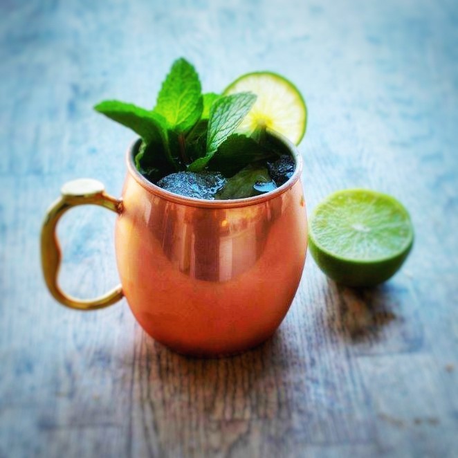 - Pour 2 oz. ginger lime syrup and 2 oz. Irish whiskey into an iced copper mule mug.