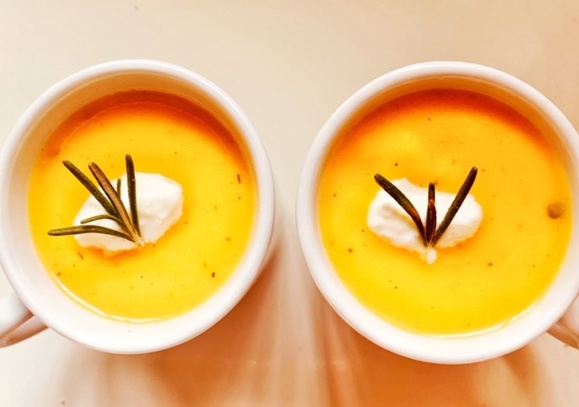 - Dispense the soup into shot glasses or espresso cups. Garnish each portion with a tiny dollop of creme fraiche and sprig of herb.