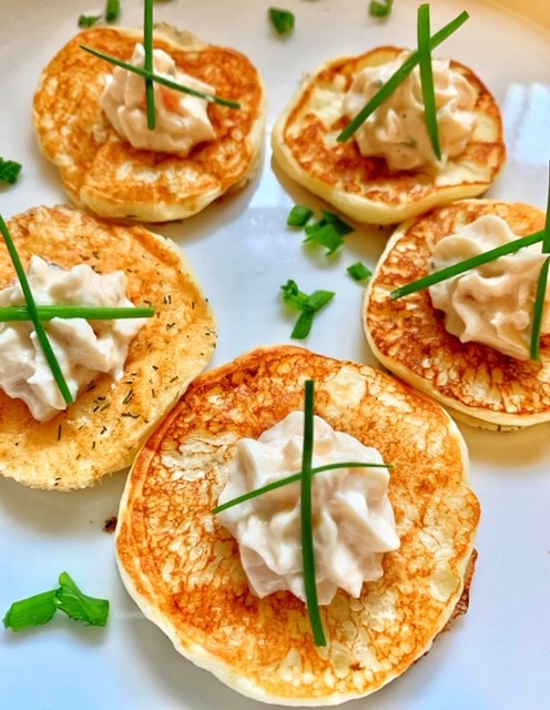 Inject in small pastry shell and garnish with nutritional yeast and fried crushed basil.